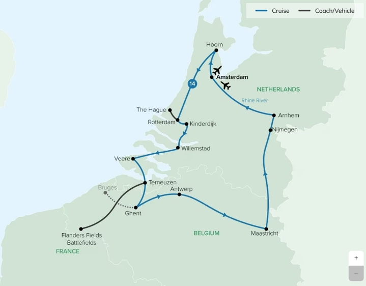 Discover the Netherlands and Belgium on a scenic river cruise with Travelmarvel. Wander Amsterdam’s charming canals, explore The Hague’s stately heritage, and experience the medieval beauty of Ghent and Antwerp as you sail past windmills and historic landmarks.