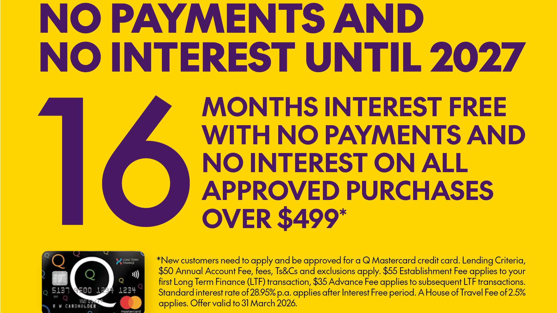 *16 Months Interest Free with no payments and no interest is available for in-store purchases only until 31/03/26. Min Spend $499. New customers need to apply and be approved for a Q Mastercard credit card. Lending criteria, $50 annual Account Fee, fees, Ts&Cs and exclusions apply. $55 Establishment Fee applies to your first Long Term Finance (LTF) transaction, $35 Advance Fee applies to subsequent LTF transactions. Standard Interest Rate of 28.95% p.a. applies after Interest Free period. Columbus Financial Services Limited and Consumer Finance Limited reserve the right to amend, suspend or terminate the offer and these Ts&Cs at any time without notice. Visit www.qcard.co.nz. A 2.5% House of Travel fee applies.